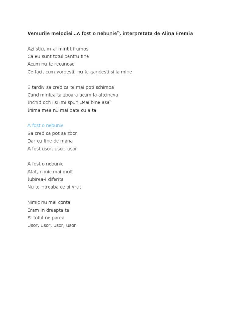 Versurile Melodiei A Fost O Nebunie Interpretata De Alina Eremia