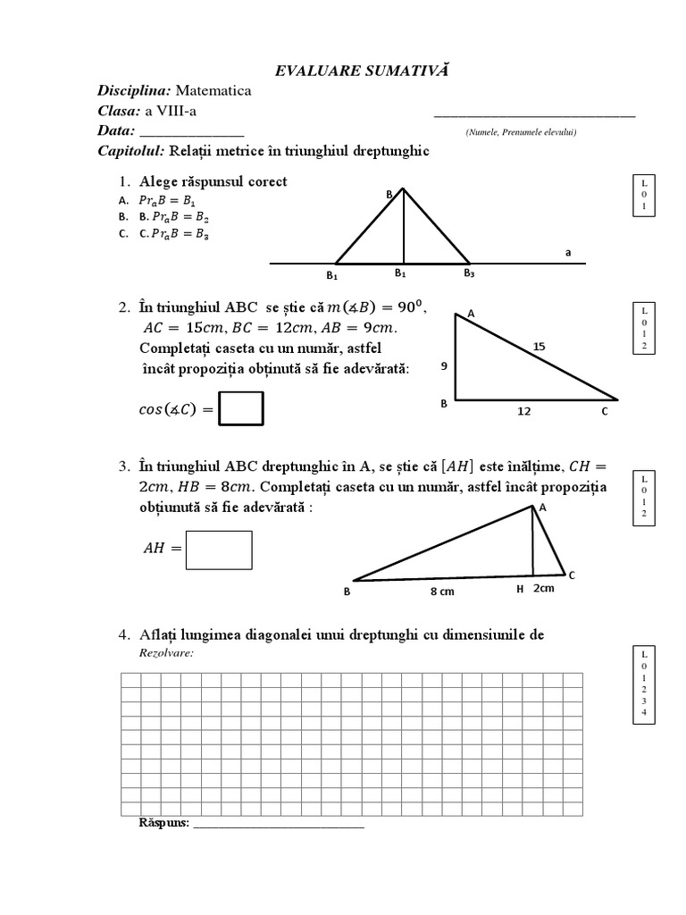 Evaluare Sumativă Relatii Metrice In Triunghiul Dreptunghic 8