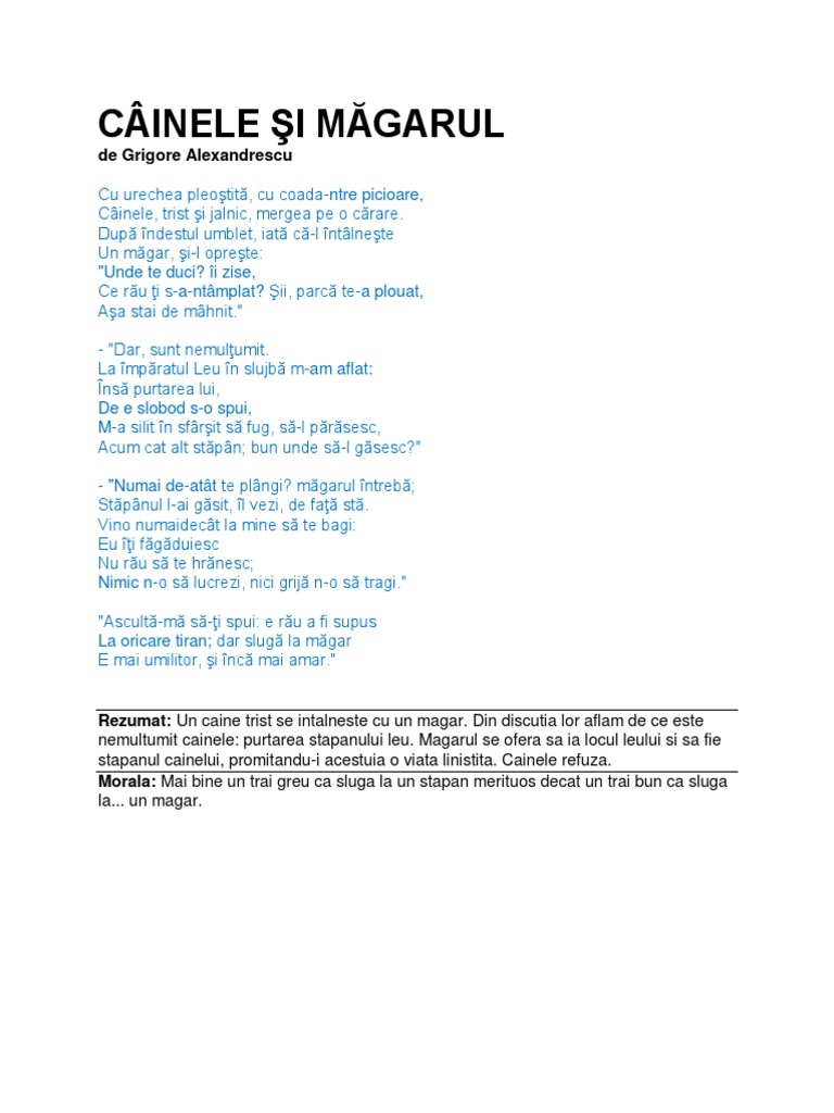 Grigore Alexandrescu Cainele Si Magarul Rezumat