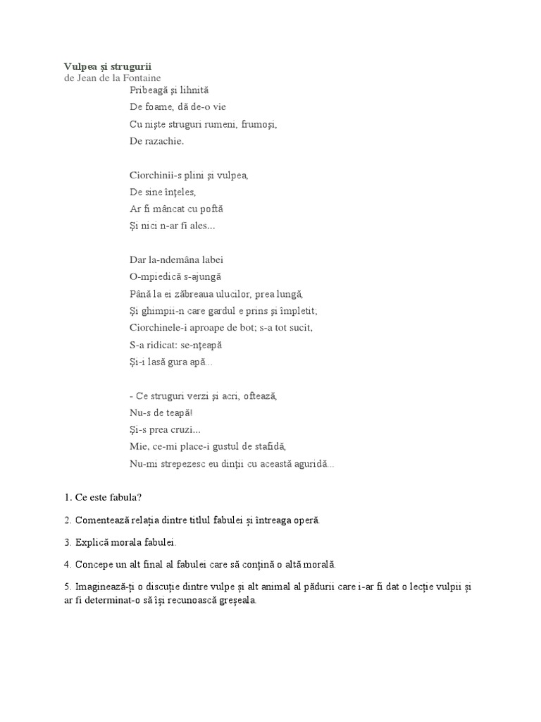 Vulpea Si Strugurii De Jean De La Fontaine Brainly Ro