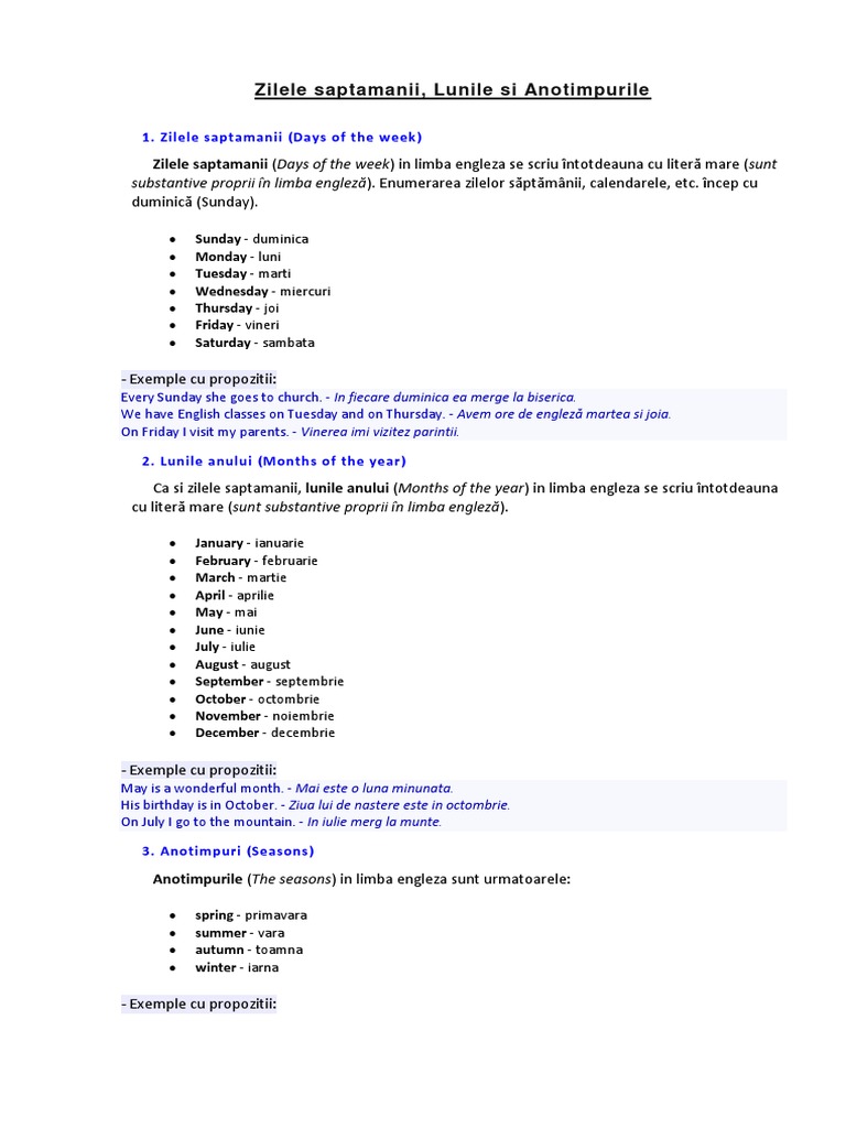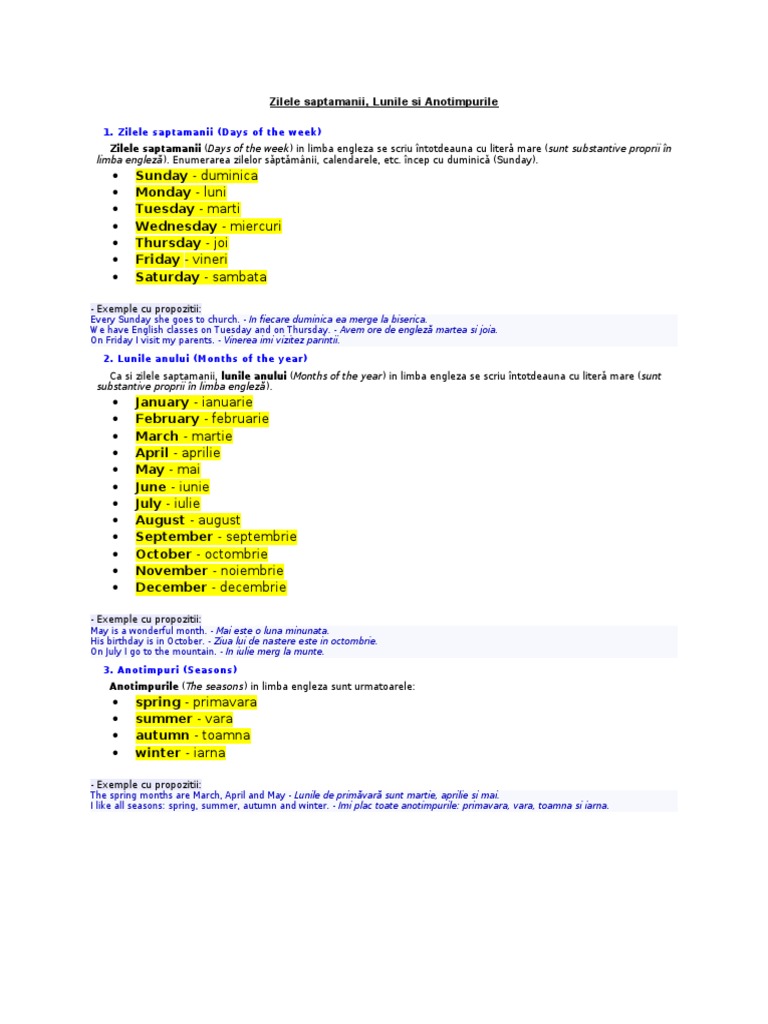 Zilele Saptamanii Lunile Anului In Engleza